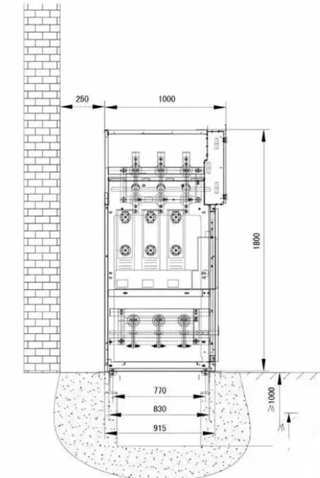 安裝時按環網柜先后順序排列在地基的槽鋼上,將柜體靠緊,并用螺栓固定旋緊,柜面應排列整齊,柜頂與屋頂的距離應大于600mm。