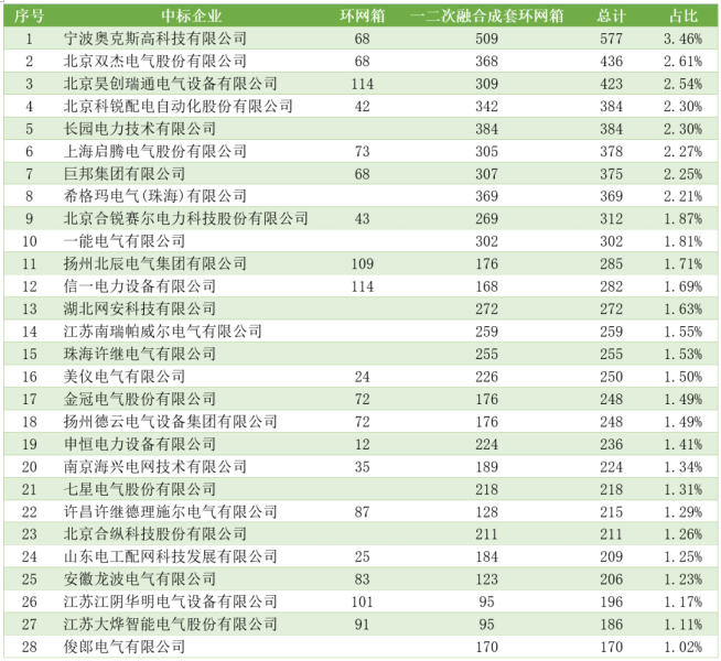 表2國網(wǎng)環(huán)網(wǎng)箱產(chǎn)品中標(biāo)企業(yè)(市場(chǎng)份額超越1%部分)
