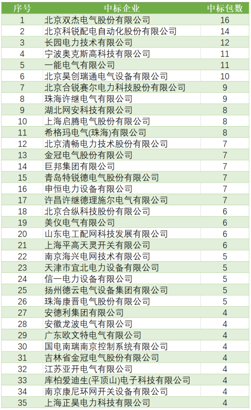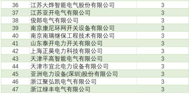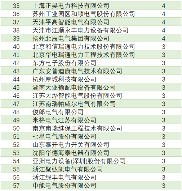 表4國網(wǎng)環(huán)網(wǎng)箱產(chǎn)品中標(biāo)企業(yè)中標(biāo)項(xiàng)目單位數(shù)(中標(biāo)項(xiàng)目單位數(shù)超過3個(gè)部分)