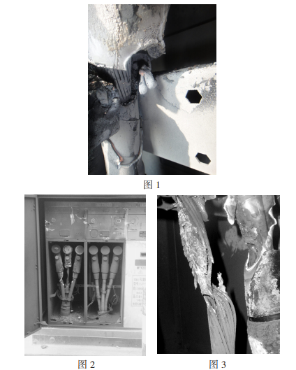 2009年2月15日,回南天,仙村站孔堂線在經(jīng)歷了長(zhǎng)達(dá)18分鐘的間歇性接地后速斷跳閘,重合不成功,K5013-0003X電纜分支箱601開(kāi)關(guān)B相進(jìn)線電纜終端應(yīng)力錐處首先短路燒毀(如圖2)。據(jù)分支箱附近商鋪店主反映,箱內(nèi)曾繼續(xù)宣布嘩啪的響聲并冒煙,終究傳出爆炸聲音。經(jīng)開(kāi)始剖析,事端原發(fā)點(diǎn)為B相應(yīng)力錐尾部,因?yàn)槊芊獠粐?yán),硅脂固化,在運(yùn)轉(zhuǎn)環(huán)境濕度較大的情況下呈現(xiàn)凝露,水氣進(jìn)入纜芯,導(dǎo)致絕緣強(qiáng)度破壞產(chǎn)生爬電。終究由間歇性接地發(fā)展到三相短路(如圖3)。此次故障相同導(dǎo)致分支箱氣室破損泄漏,分支箱報(bào)廢。