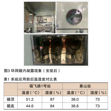 為檢驗上述方案的實際運行效果,在福州象山站安裝了一套上述微環境控制裝置(圖2)。為便于對比,在福州福飛路1號站安裝了環境監控裝置,檢測柜內環境參數。兩個環網站在同一天中,柜內相同位置處最高溫濕度對比結果(表1)表明,安裝微環境控制裝置后,通過系統自動調控風機運行的時間,降低環網箱內空氣溫度,可促進箱內和電纜溝內的溫濕度趨于均衡,減少電纜溝內潮濕空氣通過電纜接線孔進人開關柜,從而防止開關柜內電氣元件表面的閃絡現象發生。系統運行后二次艙和電纜艙凝露完全消除。
