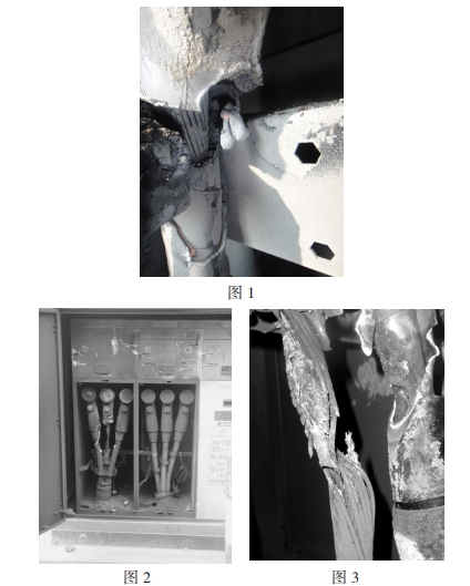 2009年2月15日,回南天,仙村站孔堂線在經(jīng)歷了長(zhǎng)達(dá)18分鐘的間歇性接地后速斷跳閘,重合不成功,K5013-0003X電纜分支箱601開(kāi)關(guān)B相進(jìn)線電纜終端應(yīng)力錐處首要短路燒毀(如圖2)。據(jù)分支箱鄰近商鋪店主反映,箱內(nèi)曾持續(xù)宣布嘩啪的響聲并冒煙,畢竟傳出爆炸聲音。經(jīng)開(kāi)端剖析,事端原發(fā)點(diǎn)為B相應(yīng)力錐尾部,由于密封不嚴(yán),硅脂固化,在工作環(huán)境濕度較大的情況下出現(xiàn)凝露,水氣進(jìn)入纜芯,導(dǎo)致絕緣強(qiáng)度損壞發(fā)生爬電。畢竟由間歇性接地發(fā)展到三相短路(如圖3)。此次故障相同導(dǎo)致分支箱氣室破損走漏,分支箱作廢。