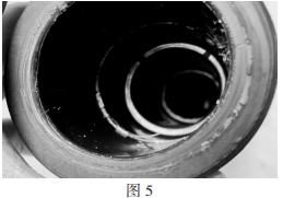 事端分支箱電纜終端所運(yùn)用的硅脂密封功用不良,故障發(fā)生后,當(dāng)拆撥其它兩相電纜頭時(shí),由于硅脂出現(xiàn)干枯粘結(jié)(如圖5),需求多人合力才華撥出,可見(jiàn)硅脂已不能起到光滑防潮與絕緣的效果,不能與電纜頭同“呼吸”,彈性功用大為下降。