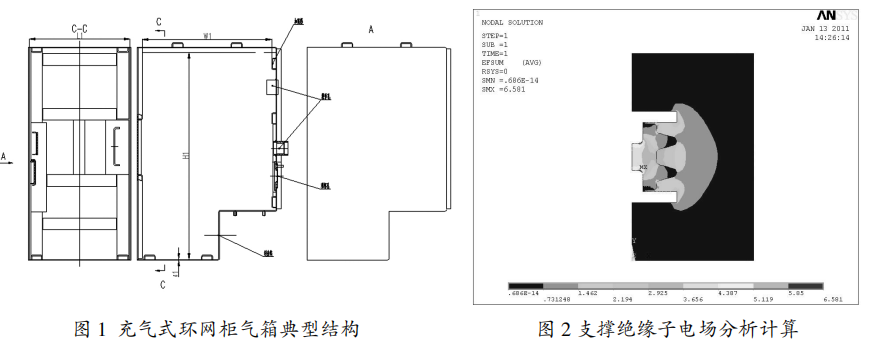 高壓帶電體對(duì)地最小空隙處在支撐絕緣子上,通過(guò)核算支撐絕緣子的電場(chǎng)如圖2,滿(mǎn)意電場(chǎng)要求,終究確認(rèn)對(duì)地最小空隙。根據(jù)最小空隙準(zhǔn)則確認(rèn)氣箱外形尺度(L1xW1xH1)。
