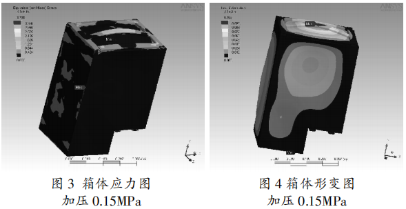 箱壁厚度滿(mǎn)意材料的許應(yīng)應(yīng)力要求及氣箱允許變形量要求。通過(guò)軟件剖析核算后得到氣箱的應(yīng)力分布(見(jiàn)圖3)及箱體形變(見(jiàn)圖4),終究找到氣箱壁厚。