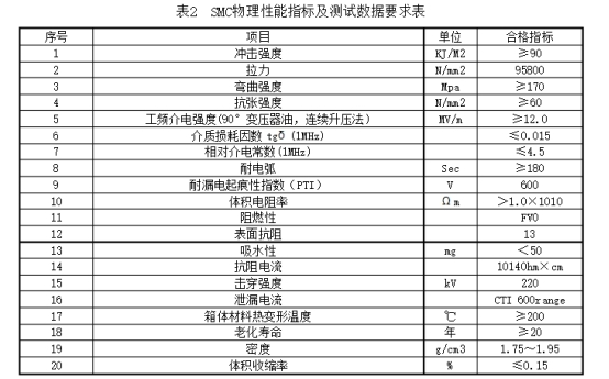 2.3.1分支箱外殼選用S304不銹鋼材料,箱體、門體材料厚度均不該小于2毫米,或SMC復合材料箱體,SMC物理功用方針及測試數據滿意表2的要求。